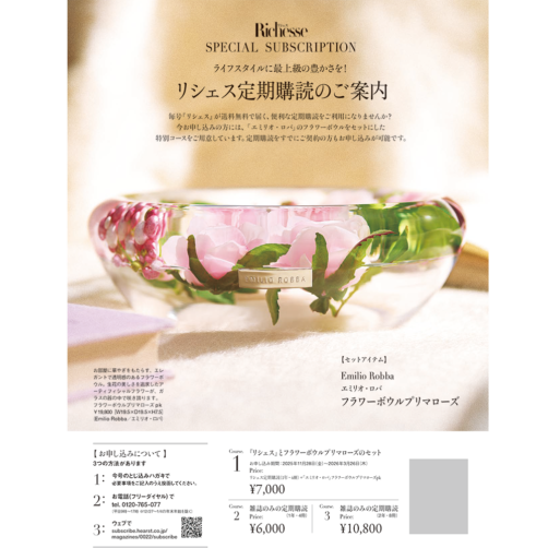 このたび、ハースト婦人画報社発行の雑誌【リシェス】にて、定期購読特典としてエミリオ・ロバのフラワーアートが採用され、誌面にも掲載されました。