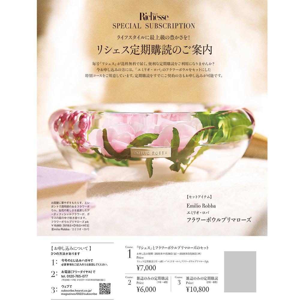 【リシェス】は、洗練されたライフスタイルや上質な美意識を大切にする読者から支持されている雑誌です。 そのような媒体の企画において、エミリオ・ロバの作品をお選びいただけたことを、大変光栄に思っております。