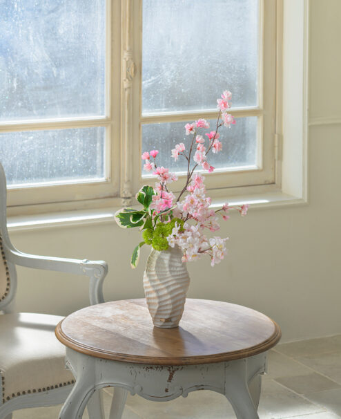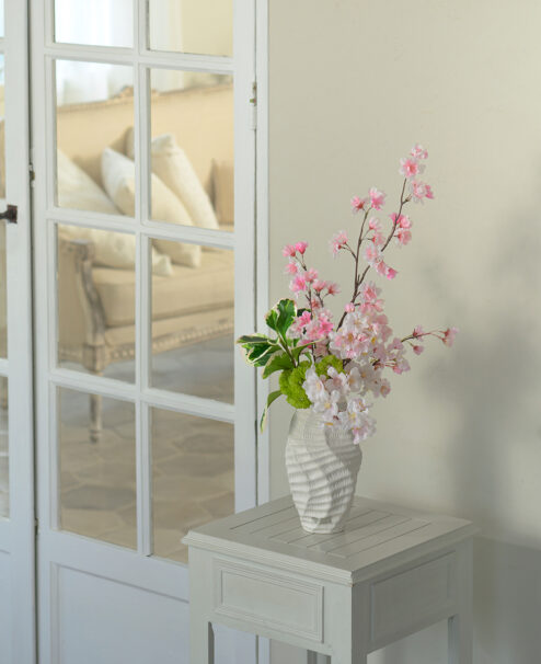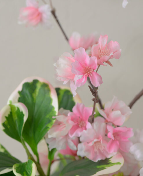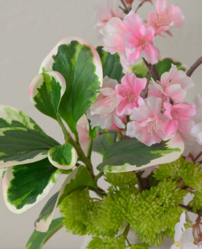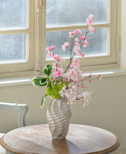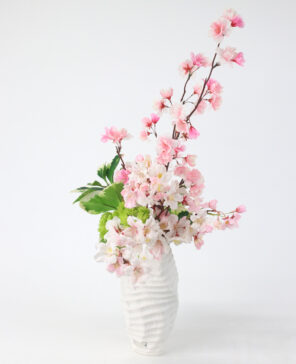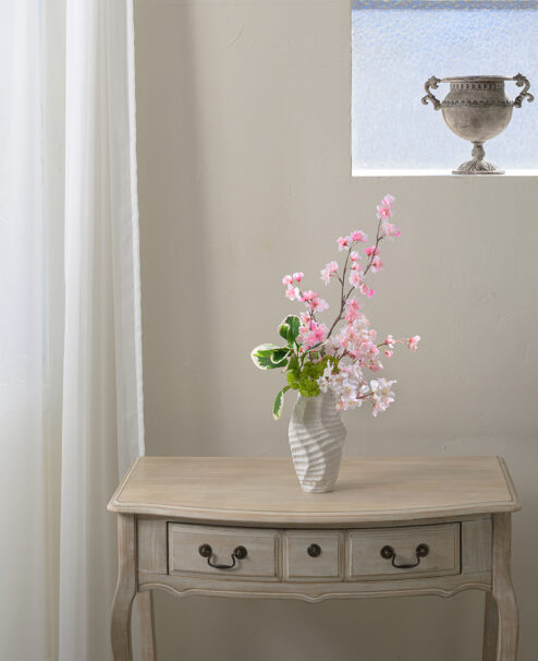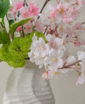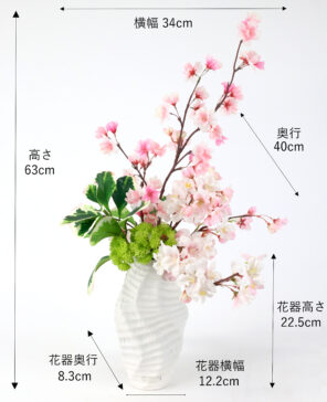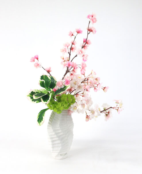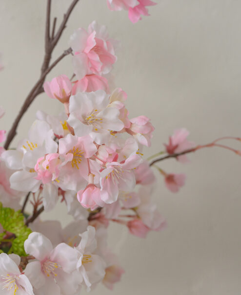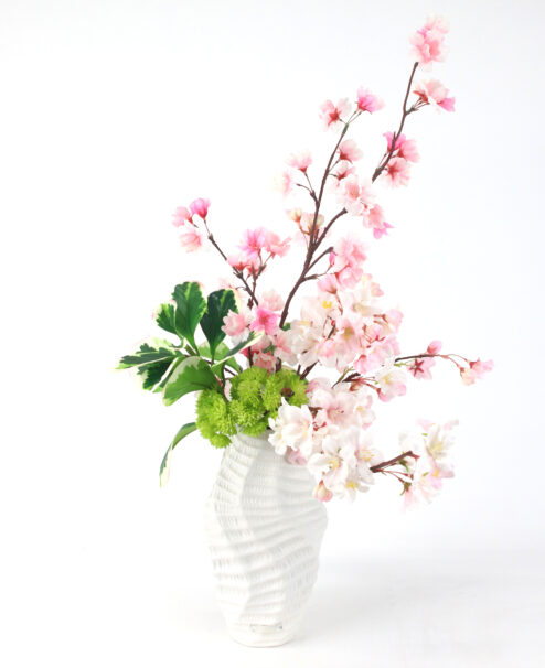 風に揺らぐようなエアリー感が魅力の桜を主役に、伸びゆく枝の美しさをそのまま生かした、ナチュラルな立ち姿のデザイン。ソフトピンクの繊細なグラデーションに、ライムグリーンをさりげなく添えることで、春らしい華やかさとモダンな印象をプラスしました。 軽やかさと存在感を併せ持ち、空間にやさしく春の気配を運ぶ、洗練された桜アレンジです。 使用花材:桜(ソメイヨシノ)、セダム、ぺペロミア