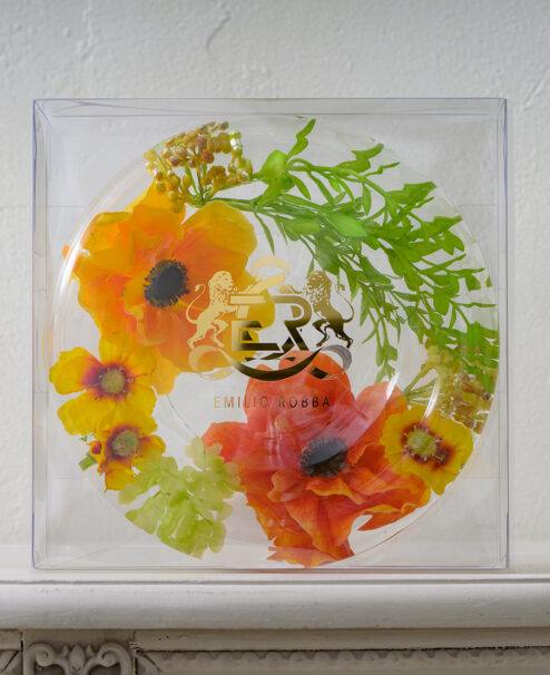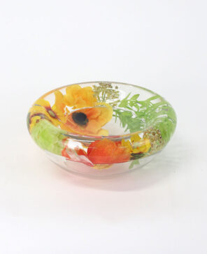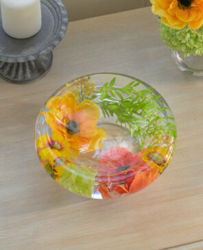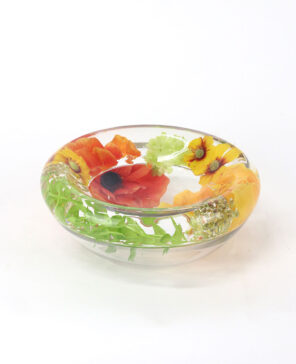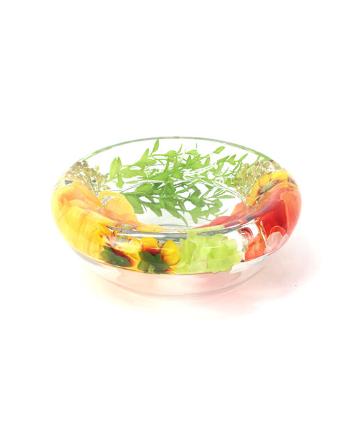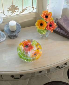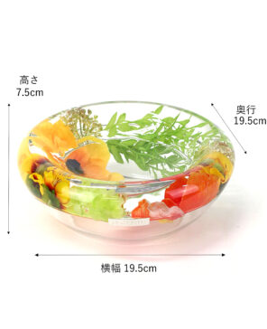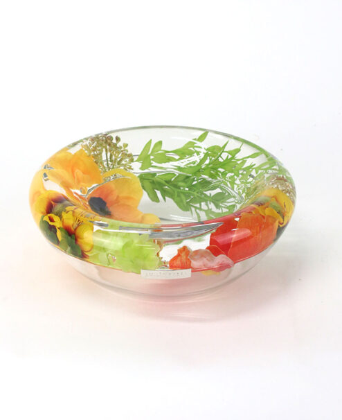 ガラスベースに、水に見立てた透明な樹脂を合わせたイリュージョンフラワーのアネモネのフラワーボウルデザイン。