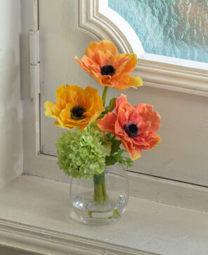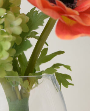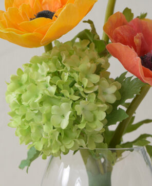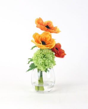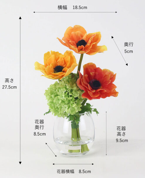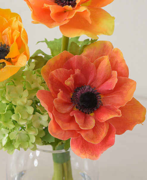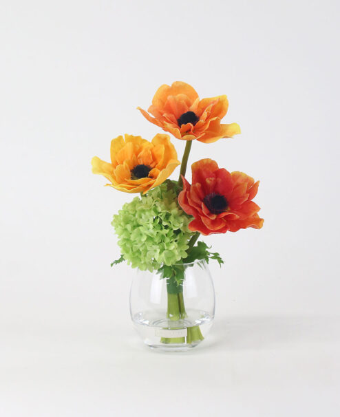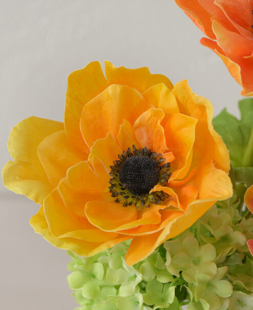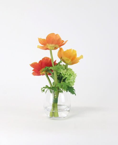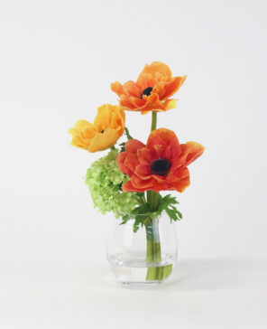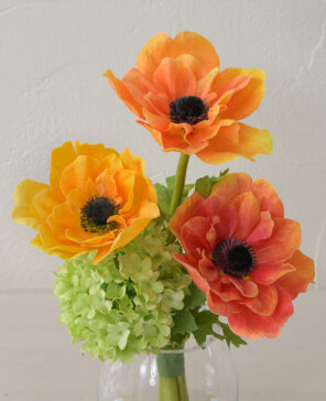 オレンジの濃淡をアクセントに、エネルギッシュなビタミンカラーが目を惹く彩り豊かなアレンジ。 花顔が重ならないよう、計算された高低差と奥行きを持つデザインで、凛とした表情に仕上げました。 使用花材:アネモネ、スノーボール