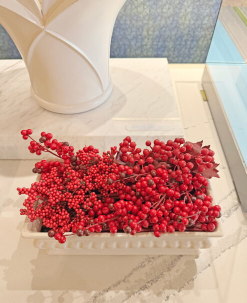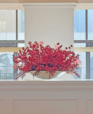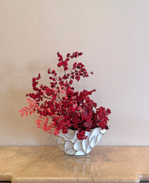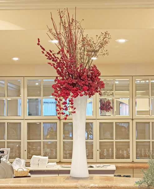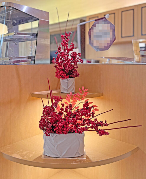 昨年のテーマを継承し、「新春」らしく縁起の良さを象徴する赤い実をたくさん取り入れたデザインです。