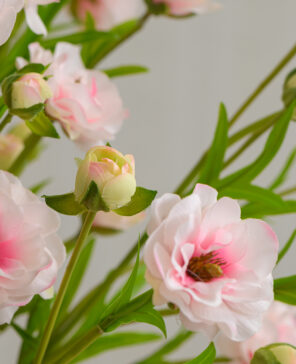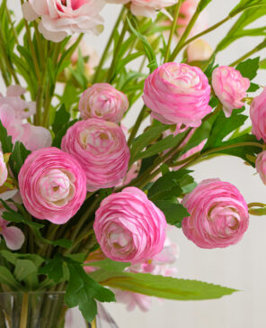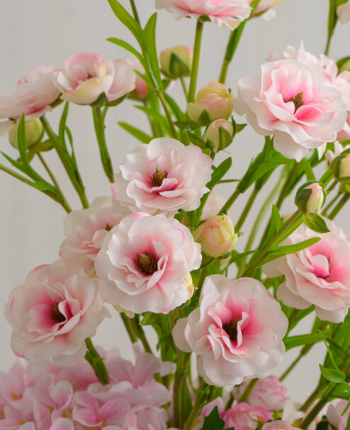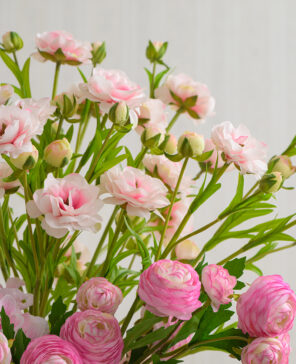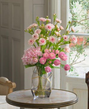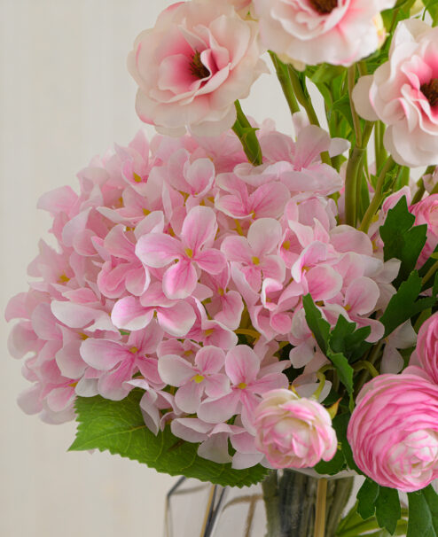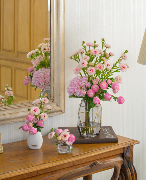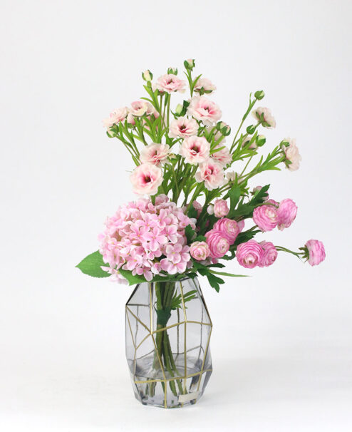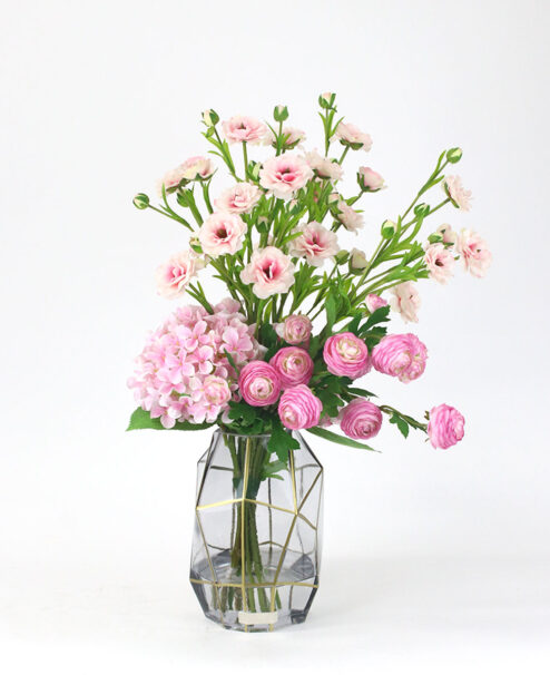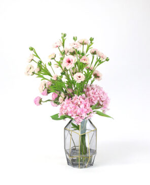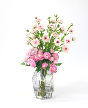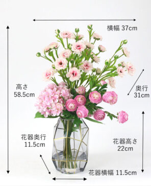 小花と一重咲きのラナンキュラスが奏でる華やかなハーモニー。 エアリーな雰囲気と共にインテリアに溶け込み、洗練された空間を演出します。 春の訪れを祝うギフトとしても、手に取るたびに新たな発見がある上質な美しさをお届けします。 使用花材:ラナンキュラス(ラックス)・ラナンキュラス・アジサイ